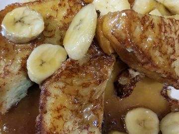 Challah French toast topped with sautee'd bananas in brown sugar and dark rum